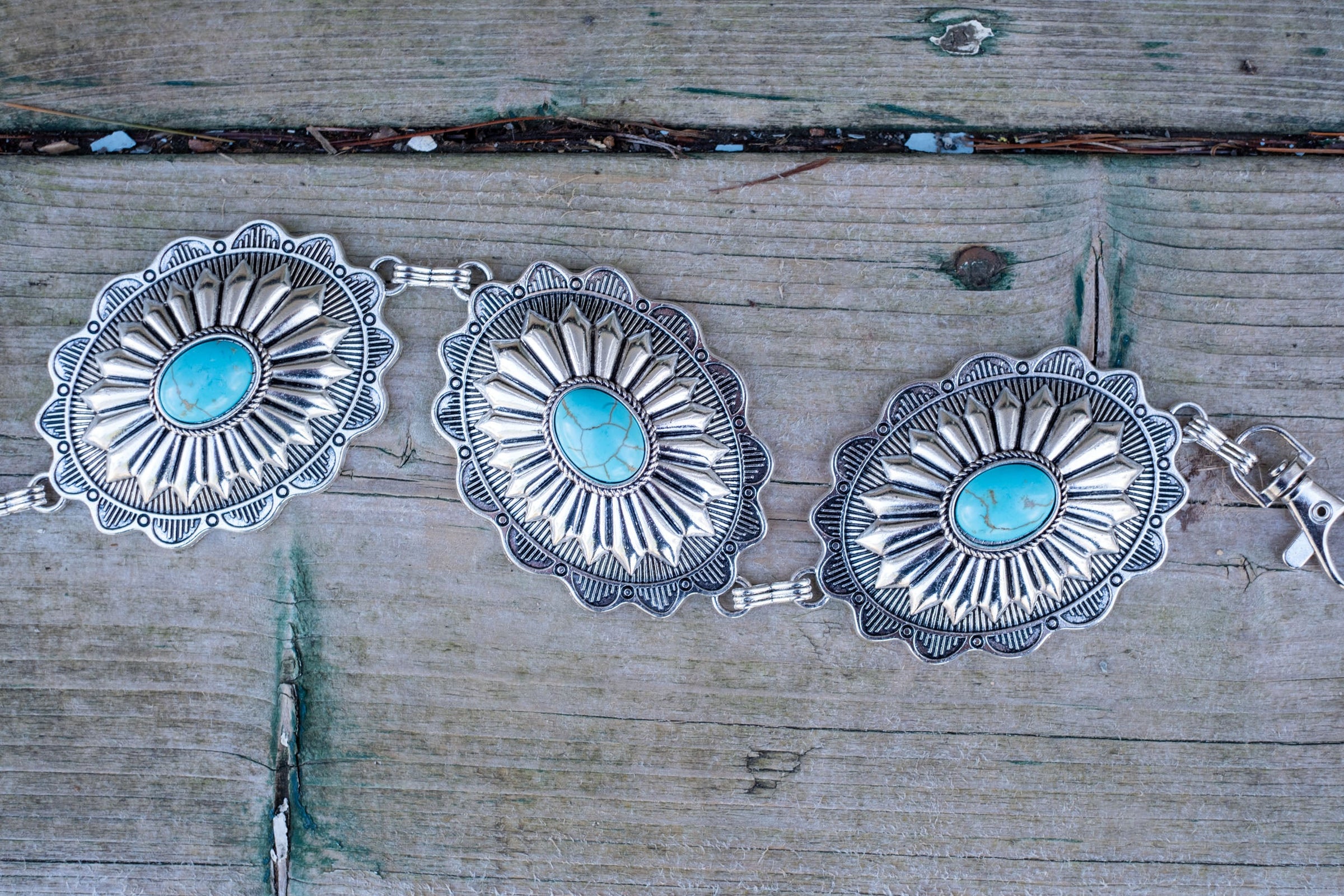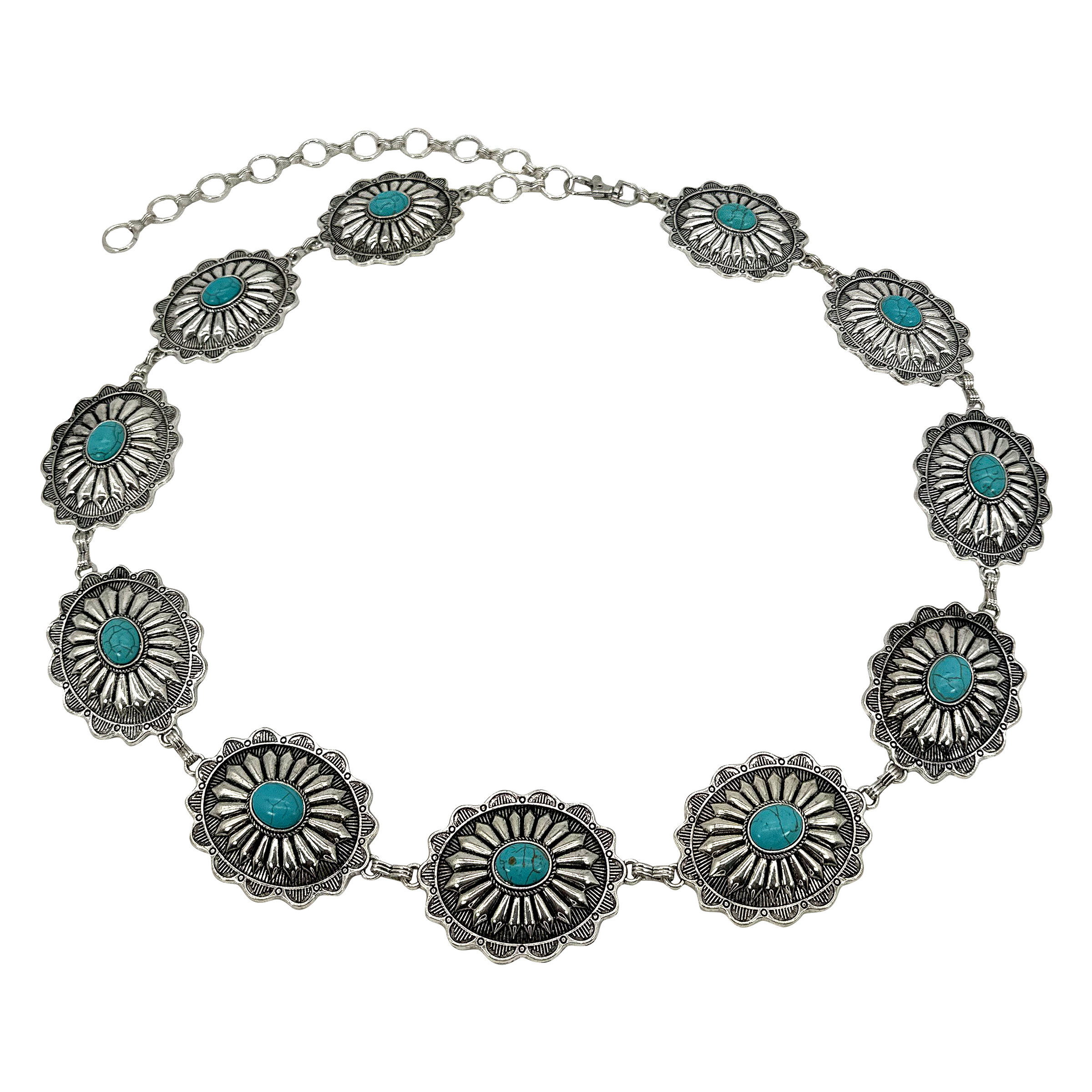 These unique concho belts adds a bold, Western-inspired touch to your outfit. For details on the history of turquoise and to view other turquoise accessories, including this item, visit our blog "Turquoise Dreams". Crafted with intricate patterned conchos and adorned with natural turquoise stones, these pieces make a striking statement accessory. The chain link design gives it a stylish, versatile look that pairs effortlessly with jeans, skirts, or dresses. The belt features a convenient lobster clasp closure, offering a secure fit and adjustability. With a 35-inch body length and an additional 10-inch extension, you can tailor it to suit your style and comfort.