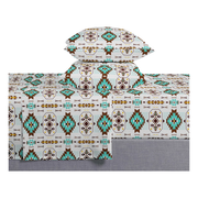 Redefine your sleeping space with this four-piece Indigenous art bed sheet set. These sheets are guaranteed to spruce any bedroom with the sheets' bold geometric prints. Designed with both comfort and style in mind, the premium polyester material of these sheets ensures a silky-smooth feel against your skin. With its wrinkle-resistant, lightweight, and super soft microfiber fabric, maintenance is effortless. We carry sheet sets for Queen and King bed sizes. Available in a range of tribal colours and patterns, they are sure to bring an element of heritage and culture to your space. These Native patterns by the renowned Indigenous artist Jason Cromarty draw from his Oji-Cree ancestry, and belonging to the Peguis First Nation, Cromarty imbues each piece with a captivating fusion of tradition and contemporary artistry. *Each set includes a fitted sheet, a flat sheet, and two pillowcases
