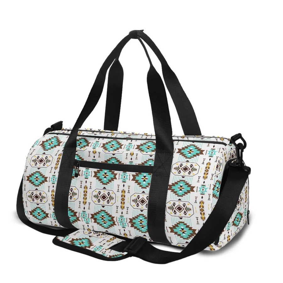 With ample storage space and convenient features, this Indigenous art travel bag is perfect for carrying your essentials in style. Created in collaboration with acclaimed First Nations Oji-Cree artist Jason Cromarty, it seamlessly blends practicality with cultural richness. This bag is perfect for an overnight trip or trek to the gym. Durable straps, multiple compartments and metal zippers make this bag practical for organizing your belongings. Get this stylish and functional Indigenous art travel/gym bag today!