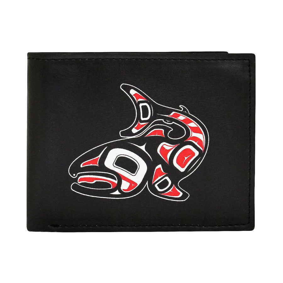 Gitksan Native Artist Jamie Sterritt has designed this handsome wallet. Store your cards and money safely in this quality and fashionable wallet. This wallet is made of PU (polyurethane leather) and measures 8.5 x 11cm when folded. The organized interior has two compartments for bills, 1 photo slot, and 4 card slots. "According to Indian legend, salmons are real people in fish form. They swim up the river to provide food for the people of the West Coast." - Jamie Sterritt
