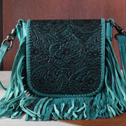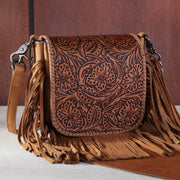 Genuine Leather Tooled Floral Fringe Crossbody Purse