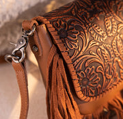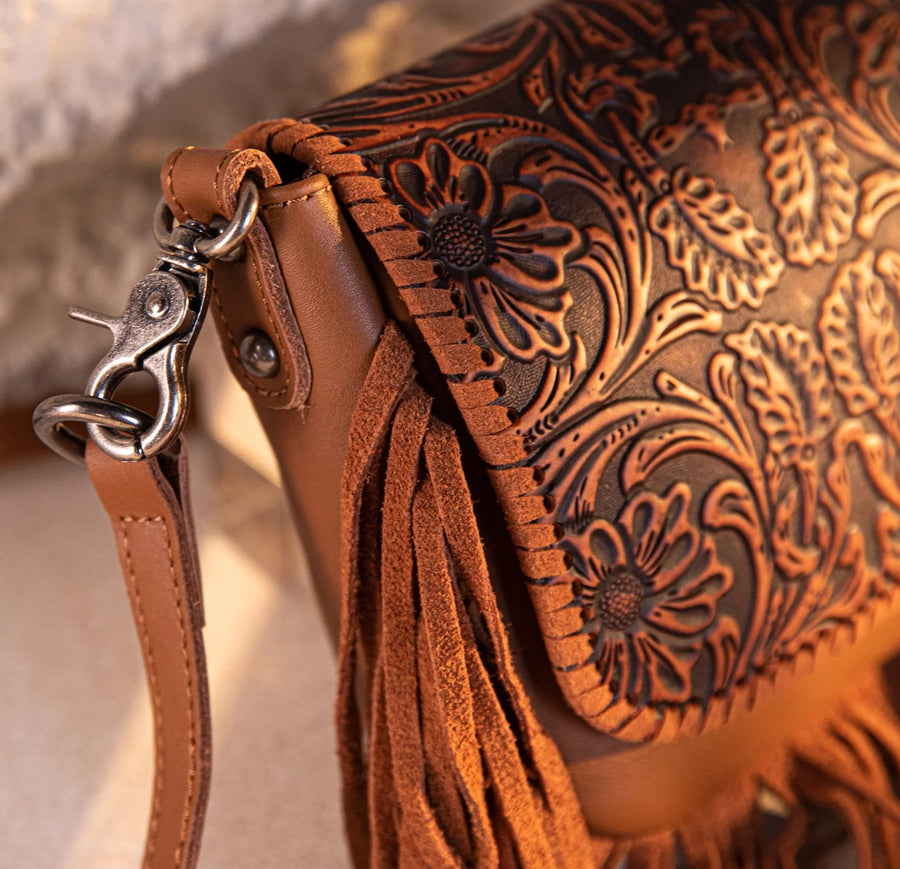 This crossbody bag combines timeless vintage charm with modern functionality. Made from genuine hair-on leather, it features an intricately tooled floral design on the flap, secured with a magnetic button closure. The soft leather fringe adds a touch of bohemian flair, while the top zipper ensures your belongings stay secure. Inside, the bag has a zippered pocket and an open pocket for easy organization. The back also includes a convenient zipper pocket for added storage. With a detachable and adjustable 48-inch shoulder strap and a lobster clasp that allows it to convert into a clip bag, this piece is as versatile as it is stylish. Measuring 7.5" x 2" x 7" with a 24" drop and polyester lining, it's perfect for everyday use or special occasions. Each bag is one-of-a-kind, with natural color variations and unique characteristics of genuine leather, making no two bags precisely alike.