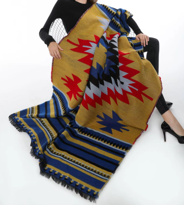 Wrap yourself in warmth and style with these stunning 'Pashmina feel' shawls, perfect for chilly Autumn and Winter days. Extra large and versatile, they can double as a cozy blanket to drape over your legs or shoulders. Featuring vibrant tribal Aztec patterns, these shawls add a pop of color and charm to any outfit while keeping you snug and comfortable.