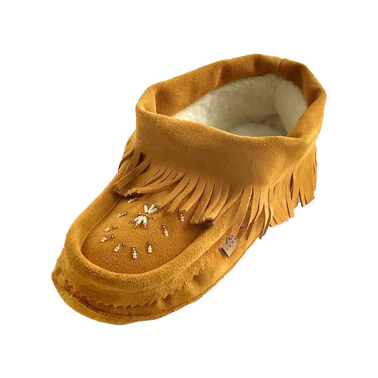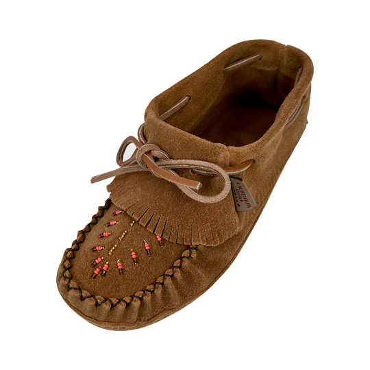Women are busy and need shoes that are comfortable. Uncomfortable shoes can cause leg and back pain, not to mention blisters and sores on your feet. After you wear shoes all day long, nothing says ‘welcome home’ more than a cozy pair of ladies slippers or house shoes. You can treat your feet to comfort and style when you buy the best indoor or outdoor shoes marked at the right discount price.When you buy women’s genuine leather or suede Canadian handmade moccasins you are purchasing the best option for casual shoes or indoor slippers. Real Native American moccasins are naturally stylish as they include many fashionable accents such as fringes, Indian beaded designs on the vamps and fur or shearling/sheepskin trims. These subtle accents make your hard sole outdoor moccasin shoes or soft sole slippers look unique and chic. Authentic Native American ladies moccasin shoes or slippers come in neutral colors due to the natural genuine leather and suede such as black, brown, tan or beige. This means you can wear your women’s moccasins with virtually any outfit and still look great. Traditional women’s moccasins never go out of style, they have been around for centuries and have a classic design. Another wonderful feature with moccasins is the comfort level. Since traditional moccasins are Canadian handmade from genuine leathers such as deer, elk, cow or moose hide, they are extremely soft and flexible. Real genuine leather and suede is pliable and will stretch and mold to your feet for the best most comfortable fit. Most authentic Native American moccasins whether they are hard soled for outdoor use or soft soled for indoor use, have a foam padding giving you the perfect amount of cushioning. So not only will you look stylish in your handmade moccasins you will also feel cozy and enjoy wearing them. They will become your favorite pair of ladies casual shoes or indoor slippers.