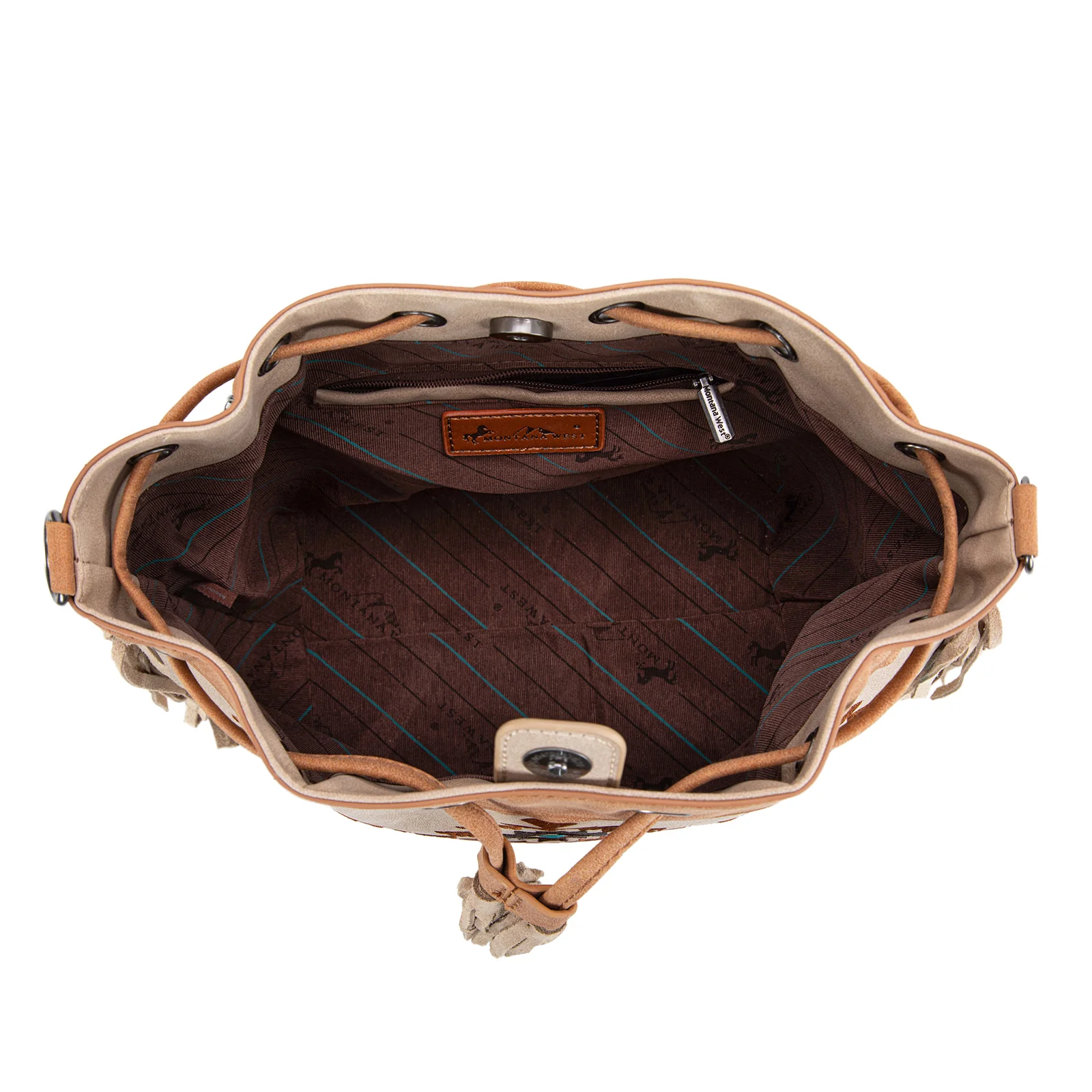 This bag speaks to your inner cowgirl and combines frontier fashion with functionality. Crafted from soft, suede-feel PU leather, this beautifully detailed bag features an embroidered Aztec pattern accented with fringe and tassel details for a timeless, boho-western look. The drawstring top is complemented by a magnetic button closure, offering both style and security, while the structured base with metal feet provides added protection and stability.