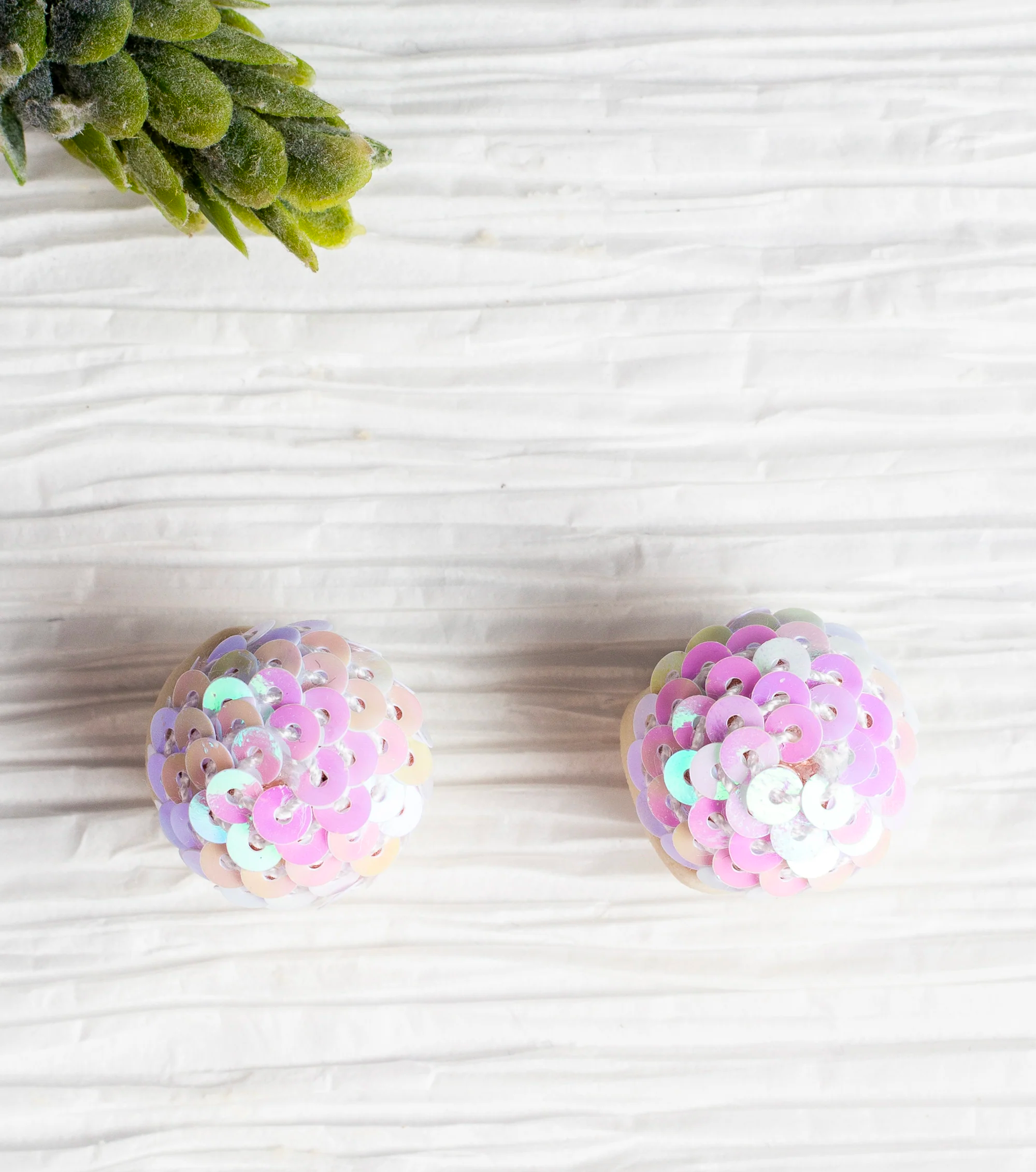 These earrings are both playful and glamorous. These statement studs are called "Sparkle in Your Eyes" because that's what they do, sparkle and shine with each turn of your head. Crafted with layers of shimmering sequins, they catch the light beautifully, shifting in colour with every movement for a dazzling effect. Perfect for dressing up an everyday outfit or completing a chic evening look, they bring a festive yet elegant vibe that works equally well at holiday parties, weddings, or a fun night out with friends. What makes these earrings so special is their unique texture and luminous finish—offering just the right amount of sparkle to brighten your style without being overwhelming. These studs are the perfect accessory when you want your jewelry to stand out and shine.