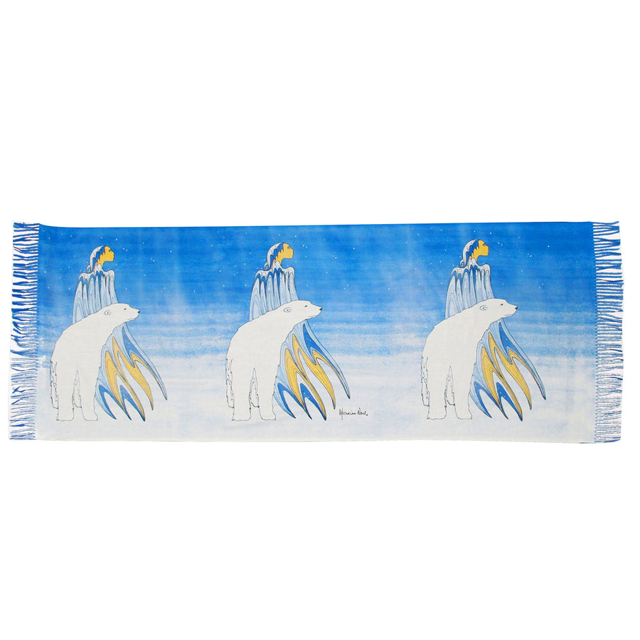 Add an element of style and a unique look with this 'Mother Winter' Art Print Shawl. The Art Print shawls are 100% acrylic, and measure 180 cm x 70 cm. Designed by Sioux Artist Maxine Noel, this shawl is a beautiful blue and white, with the print art work called 'Mother Winter'. "The great majestic polar bear blends into the winter landscape...protected by Mother Winter." - Maxine Noel The artwork is beautiful, with Mother Winter standing tall and graceful and strong, protecting the magnificent Polar Bear at her side. These beautiful Art Print Shawls are very soft and wrap around you to keep you warm in style and grace. They drape beautifully and can be worn in a variety of ways.
