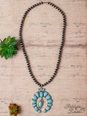 Make a bold entrance with the Talk of the Town Turquoise Squash Blossom Necklace — a stunning statement piece that turns heads without weighing you down. Crafted with vibrant turquoise stones set in a classic squash blossom design, this necklace features oxidized Navajo-style pearls that perfectly complement the showstopping pendant. Despite its impressive size, it's surprisingly lightweight and comfortable enough for all-day wear. You simply can't beat the price for a piece that brings this much Western charm and presence. Pair it with a simple black tee and jeans or your favourite dress — no need for extra accessories. This necklace does all the talking. Perfect for women who love bold, Southwestern fashion and have a true turquoise obsession.