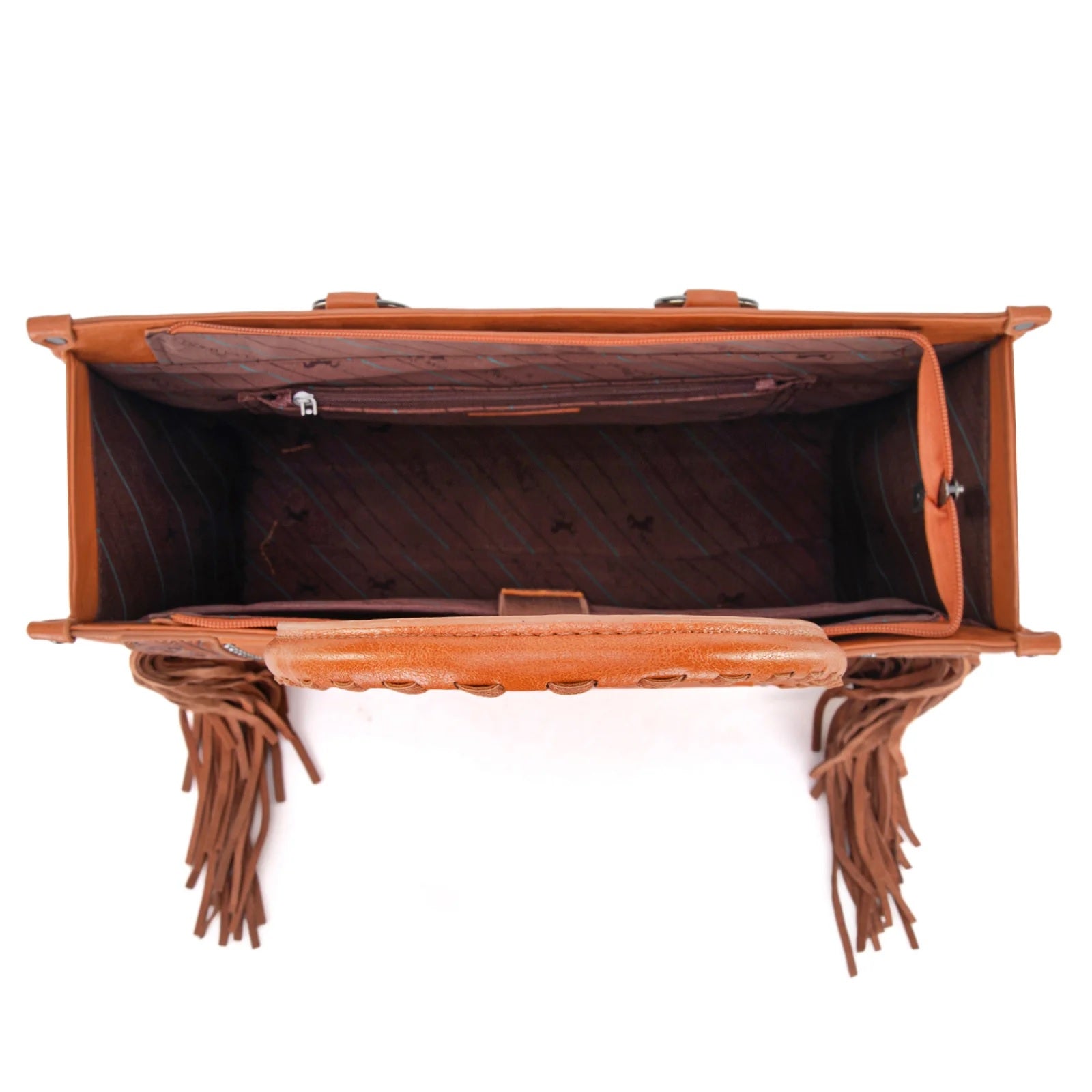 This purse blends Western flair and modern functionality. Crafted from durable PU leather, this spacious tote features an intricate floral tooled design accented with antique silver embellishments, whipstitch details, and long fringe for a striking look. The top zipper closure opens to a roomy interior with a secure zippered pocket and a padded compartment, ideal for protecting your electronics. Designed with practicality in mind, the back of the bag includes both an open pocket and a discreet zippered compartment made to conceal a handgun safely (9.5" x 5"). Double round handles with stitched detailing provide a comfortable carry, while metal feet on the bottom ensure stability and protect the bag from wear. Measuring 15.5" x 5" x 12" with a 10" drop, this tote offers style, security, and everyday convenience in one beautifully detailed package. *Matching wallet available.
