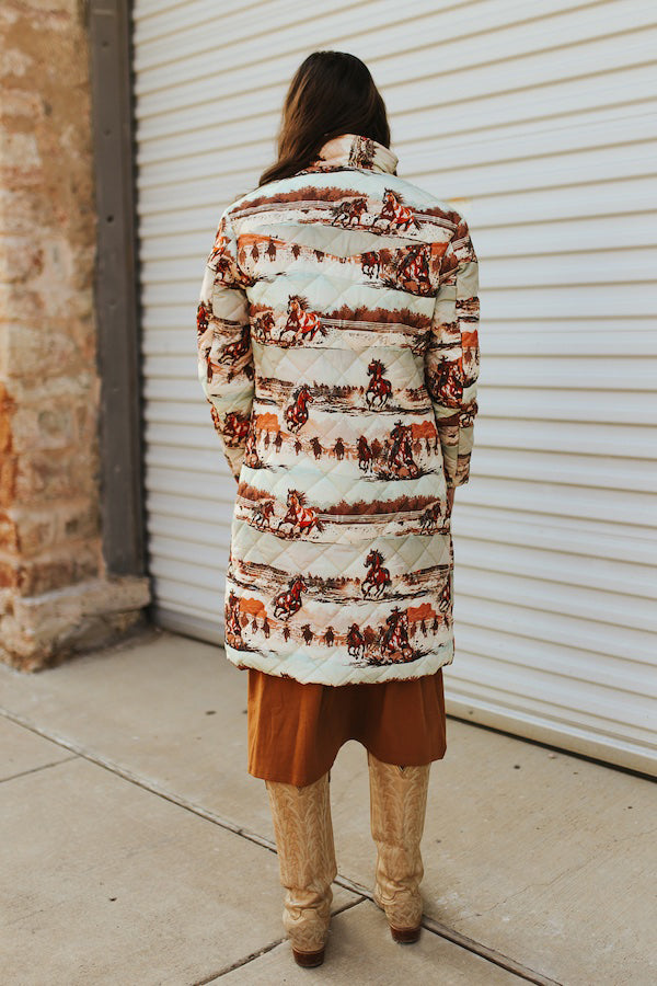 Make a bold seasonal statement with this Western-inspired quilted longline puffer coat featuring a striking allover ranch horse landscape print. Designed for comfort and warmth, it features a full-front snap closure, side pockets, and a cozy standing collar. The desert tones of rust, cream, brown, and soft sage highlight a scenic prairie print with galloping horses, cattle drives, and ranch silhouettes, bringing vintage Western storytelling to life in modern outerwear. This jacket combines functionality with artistic flair.