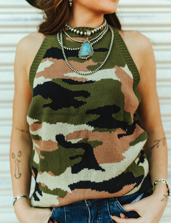 These women's patterned knit tank tops deliver bold Southwestern style with a clean, modern silhouette. Designed in vibrant colours, they feature an allover Aztec or Camo pattern in soft contrasting hues for an authentic Western look. The high neckline and ribbed trim along the collar, armholes, and hem create a structured yet comfortable fit that flatters the body while remaining easy to layer. Crafted from a soft knit with stretch, this tank is perfect worn solo in warmer months or layered under jackets and shackets for transitional styling.